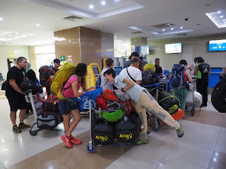 Pesamos los petates (el mío 24kg) para que los suban los porteadores al Campo 1 y lo que sabemos que no vamos a utilizar se queda en un depósito en el Campo Base.